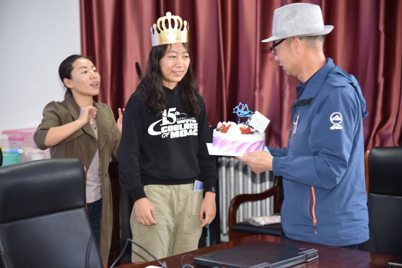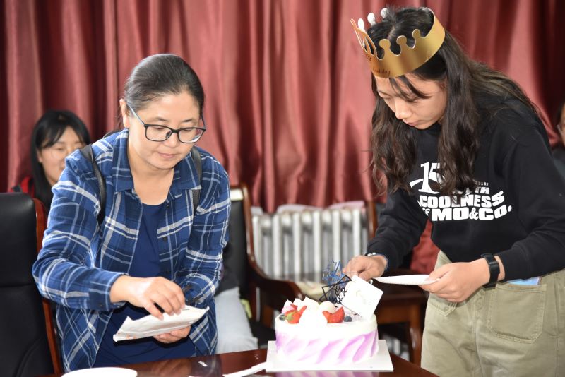 首先,为2019级本科生曹嘉桐同学庆祝生日。中秋佳节团圆日,恰巧又是逢曹嘉桐的生日,pp电子官网领导、老师特地为她准备了一份秘密惊喜,当姚书记说要为曹嘉桐同学庆祝生日时,嘉桐“受宠若惊”,对突如其来的惊喜深感意外,但随之而来的更多的是感动和无法言表的感激。当学院党总支书记白铁柱老师为她送上生日蛋糕,班主任乌木花老师和大家一起唱起《生日歌》时,曹嘉桐眼中泛起感动的泪花。随后,大家一起切蛋糕、送蛋糕、吃蛋糕,好一片其乐融融的热闹景象。