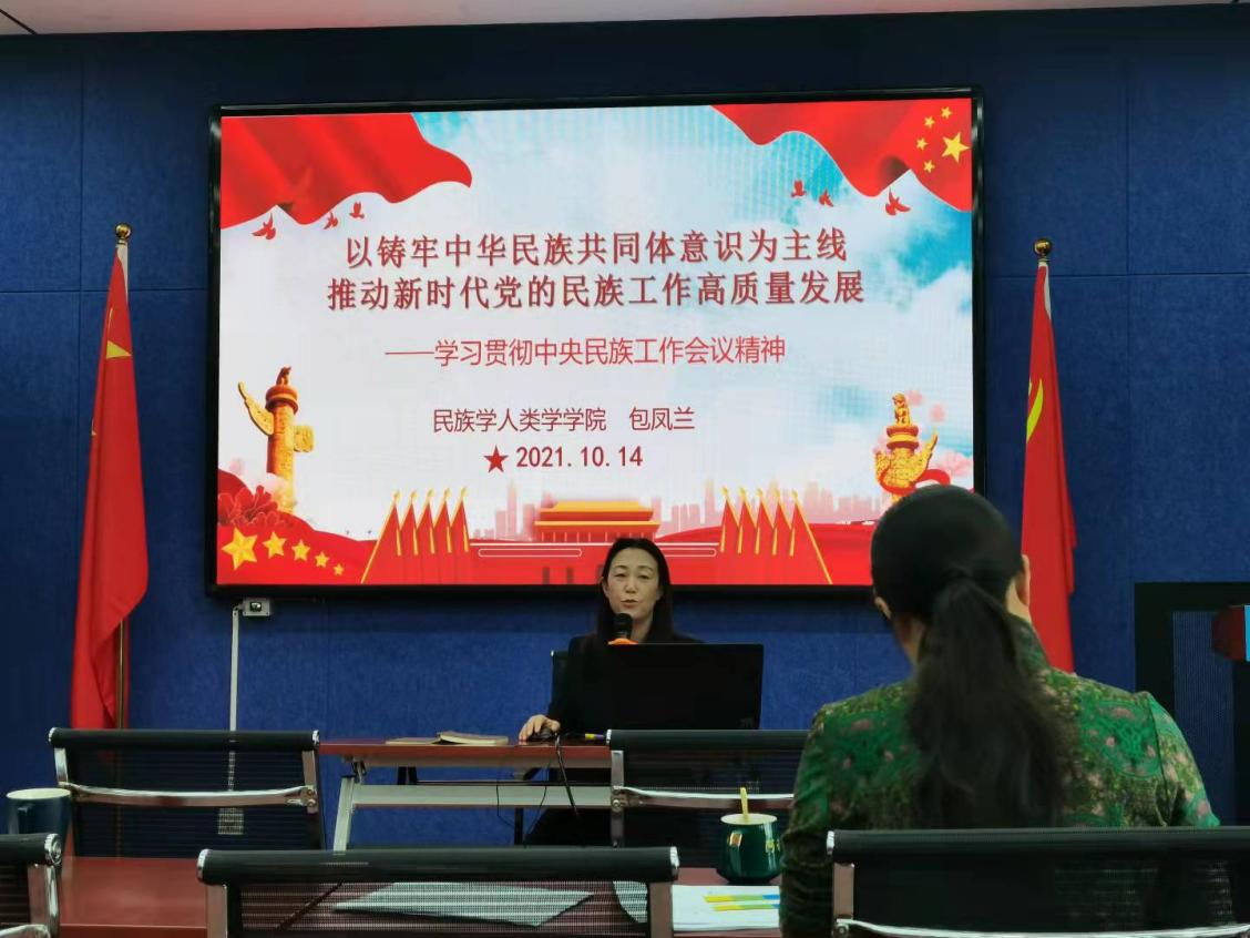 10月14日下午,pp电子官网党委书记包凤兰在田楼615会议室为全院教工做了题为“以铸牢中华民族共同体意识为主线,推动新时代党的民族工作高质量发展”的有关中央民族工作会议精神的宣讲。