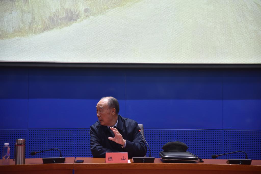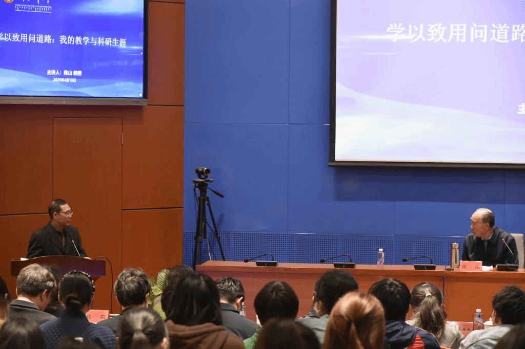 陈山教授用PPT为听众展示一幅画着道路的油画,以最接地气的方式开始演讲。陈山教授围绕自己的教学经历与科研生涯,讲述学以致用、明理问道的人生哲学。他这教导学生:“以后你们,有权不要以权谋私,有钱不要财大气粗,有势不要仗势欺人,有了学问不要恃才傲物,更不能成为一个精致的利己主义者”。