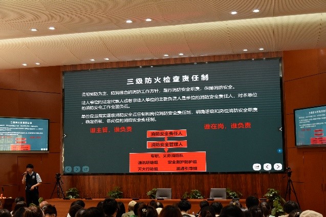李家明教官以精炼的语言着重强调校园、家庭等多方面的消防安全知识,通过播放火灾警示片,结合身边案例和工作经验,就消防日常检查、疏散逃生的基本常识、火灾的预防和应急处置、消防器材的正确使用方法等内容进行了详细讲解,希望大家养成良好的用火用电习惯,做到“人走电断”。