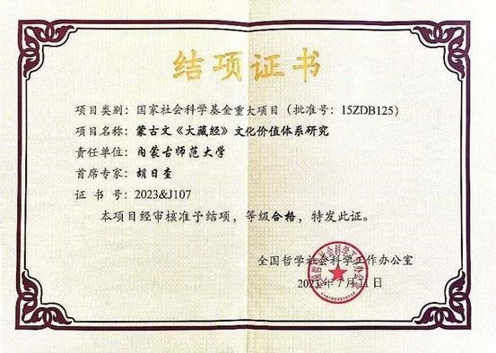 本网讯 近日,我校pp电子教师胡日查主持的国家社会科学基金重大项目“蒙古文《大藏经》文化价值体系研究”( 15ZDB125 )圆满完成研究任务,在会议鉴定获得同行专家一致肯定的基础上,经全国哲学社会科学工作办公室审批,获“合格”等级,顺利通过结项验收。