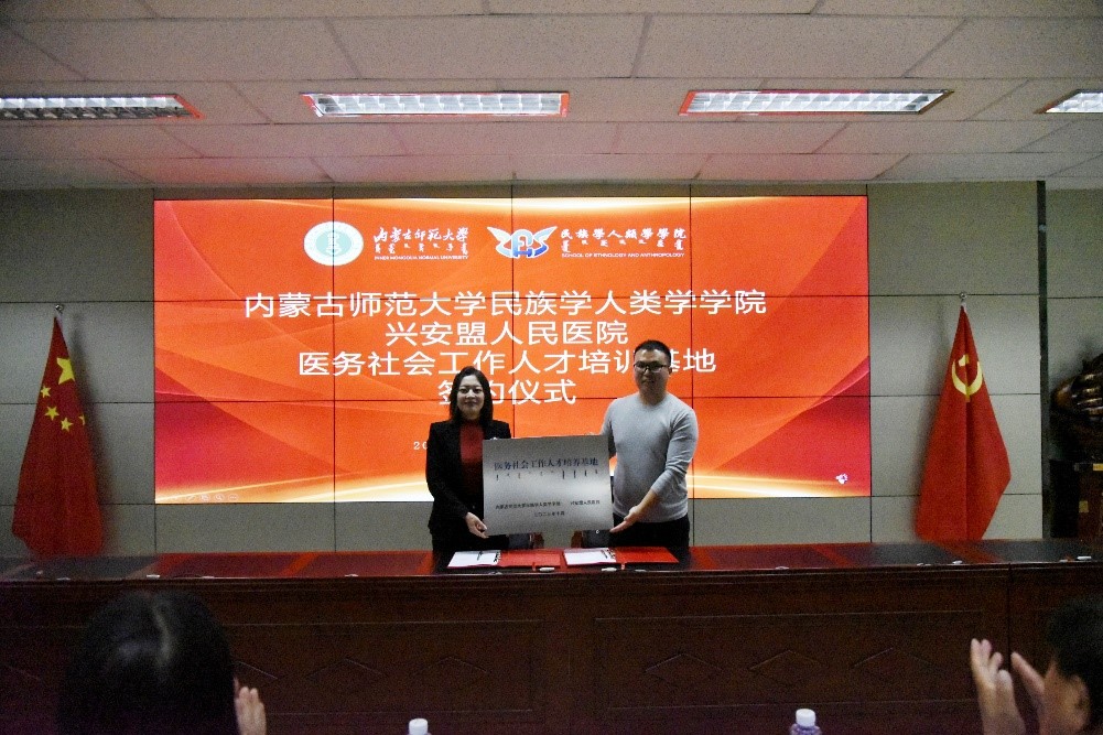 由胡那苏图老师作为代表与兴安盟人民医院进行了社会工作专业实习基地协议签约与揭牌仪式。