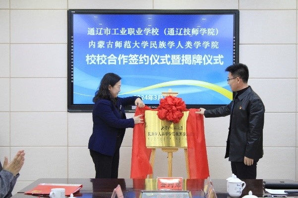 3月1日,pp电子官网党委书记包凤兰、副院长韦兰海、社会工作系主任胡那苏图与教务办公室李永硖等人前往通辽市工业职业学校,挂牌签约了教育实践基地。