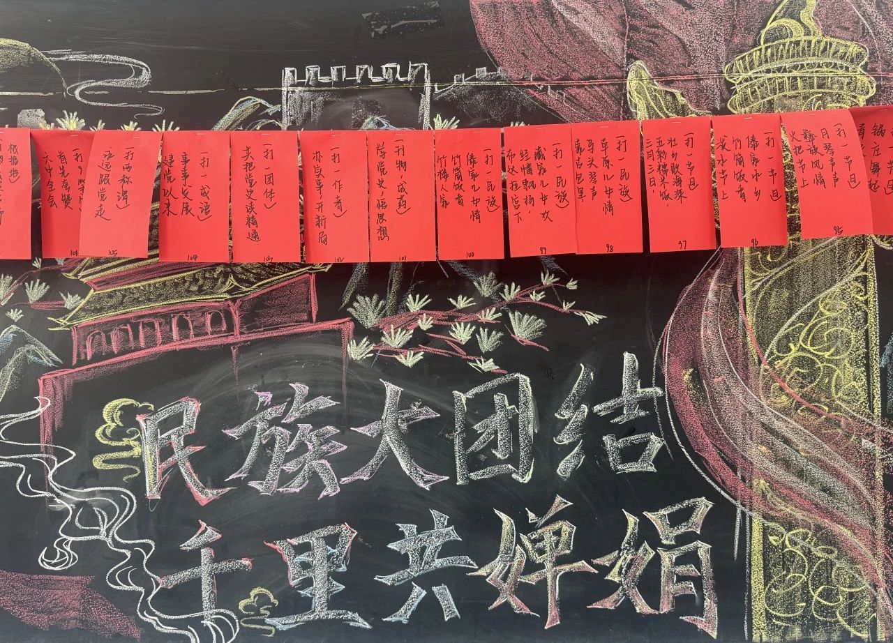 茶话会上,学院精心策划了“民族团结知识”猜谜游戏,百余副字谜题目涵盖了党史国史、各民族知识、传统文化等多个领域,既考验了同学们的智慧,又增强了大家对中华民族多元一体的认同感。老师和同学们争相竞猜,活动现场充满了欢声笑语。学院为猜中谜底的同学们准备了精心挑选的小礼物,每一份礼物都承载着对同学们的鼓励和对学院各民族同学互亲互爱共同进步的期许。
