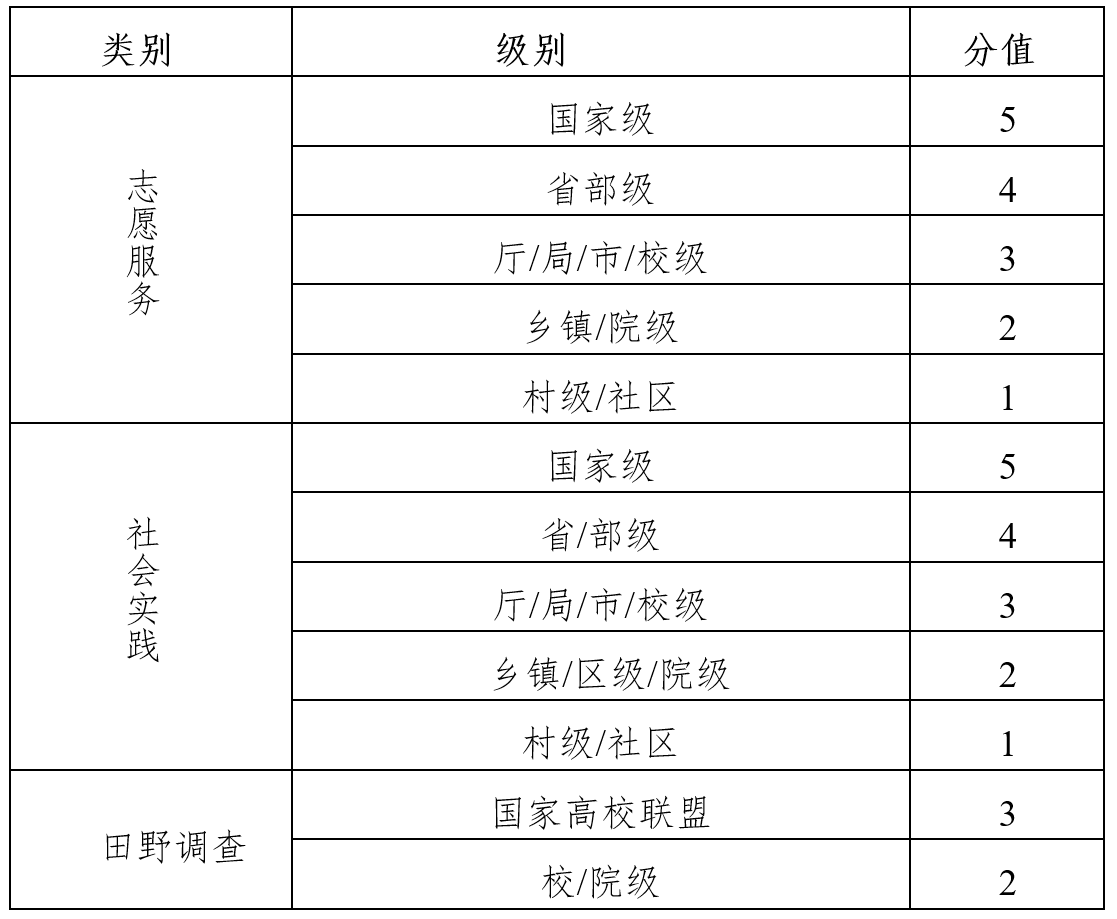 按照学校文件要求,鼓励和指导研究生进行各类劳动教育综合实践活动,增强公共服务意识和担当精神。因此参加各级各类志愿服务活动、社会实践活动、田野调查等,参照下表加分。