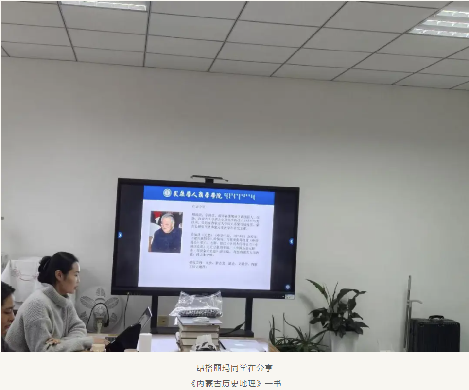 接着昂格丽玛同学分享的是内蒙古大学教授、博士生导师周清澍先生的著作《内蒙古历史地理》一书。此书内容从内蒙古史前文化的地理分布开始,以历史上的行政区划沿革为主线,较系统地描述了内蒙古地区早期人类活动、人口变迁、政权更迭、州郡变化、军镇设置,土地开垦和经济发展情况。以自然地理学的角度,阐述了内蒙古的山川形式、自然概况,以人文地理学的角度,阐述了自古以来在内蒙古建立的政权以及在内蒙古高原上活动过的北方各族的历史,尤其对不同历史时期内蒙古地区行政区划沿革进行了详细的阐释。昂格丽玛从该书的主要内容和结构、范围等几个方面详细解读,并以PPT展示给大家。让同学们对内蒙古历史地理变迁有了较为全面的认识,也让我意识到自然环境对人类社会发展的重要性,以及历史地理学研究对于我们了解人类历史发展有着重要的意义。