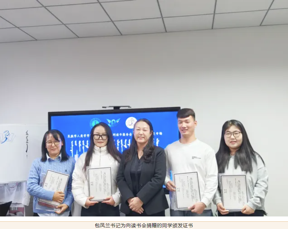 第二阶段是对2024年度读书会的总结。“碧立格”系列读书会中国少数民族史专场能够一直顺利开展,离不开老师和同学的大力支持。“碧立格”系列读书会是pp电子于2019年创办的读书活动。长期以来,在本硕博不同层次的学生当中开展,收益很多,也有了一定的影响。“碧立格”系列读书会中国少数民族史专场至今已开办14场,25位师生进行了好书分享。而且,一直以来获得国家项目的教师和获得国家奖学金的同学们在不同程度地为读书会捐赠书籍或资金支持,为同学们提供了更广阔的阅读天地,拓宽了学术视野。在现场由梅荣副教授和那日苏博士分别为近期分享读书心得的6位同学赠送书籍。