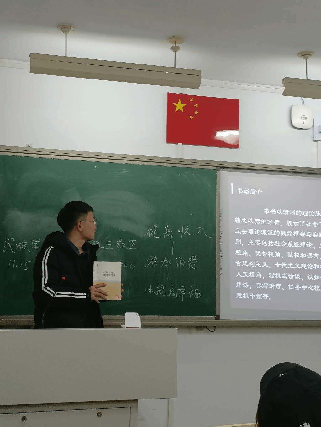 2021年11月15日傍晚7时,在盛乐校区行知楼217教室,2021级社会工作本科2班举行了第1期“碧立格”读书报告会。指导老师胡那苏图参与了此次会议。由包吐气同学为首的6名同学对《社会工作理论与方法》这本书进行了分享报告。