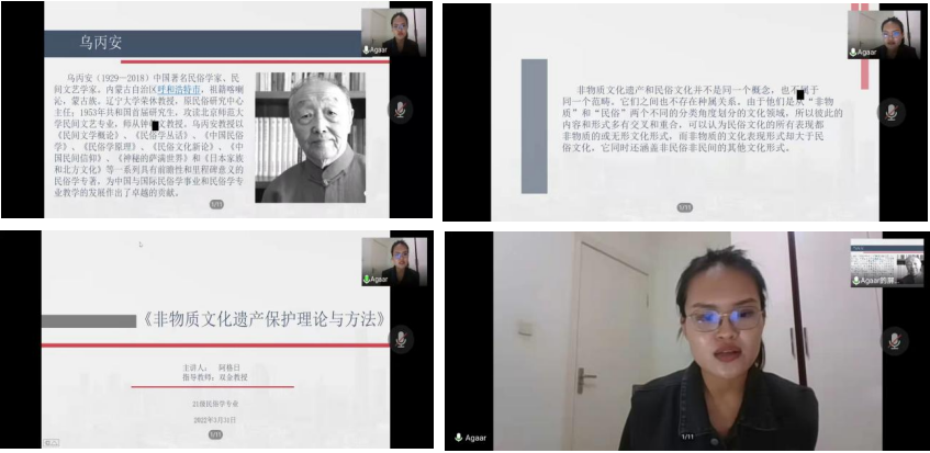 pp电子2021级学硕一班硕士研究生第5期“碧立格”读书报告会于3月31日晚19点在腾讯会议上举行,21级学硕一班硕士研究生全员参加本次读书报告会。本次读书报告会的汇报书目是《非物质文化遗产保护理论与方法》,主讲人是21级民俗学专业硕士研究生阿格日同学,主持人是21级民俗学专业硕士研究生王永梅同学。班主任阿荣老师,民俗学专业硕士生导师双金教授出席此次读书报告会并进行指导。