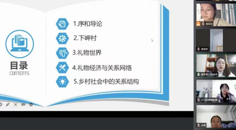 2022年4月28日晚pp电子2021级学硕一班在“腾讯会议”举行了第6期“碧立格”系列读书报告会。参加本次会议的五个专业有人类学、民俗学、宗教学、民族学、马克思主义民族理论与政策。本次读书会的汇报者是是来自2021级民族学专业的麻芳雪同学,汇报的书目是《礼物的流动》。民族学专业硕士研究生导师麦拉苏副教授出席本次读书报告会并进行了指导与评价。会议主持人是2021级民族学硕士研究生宣俭玲同学。会议主要分三大环节。分别是主讲人讲解《礼物的流动》这本书;全体参与发言与讨论;指导老师的点评。