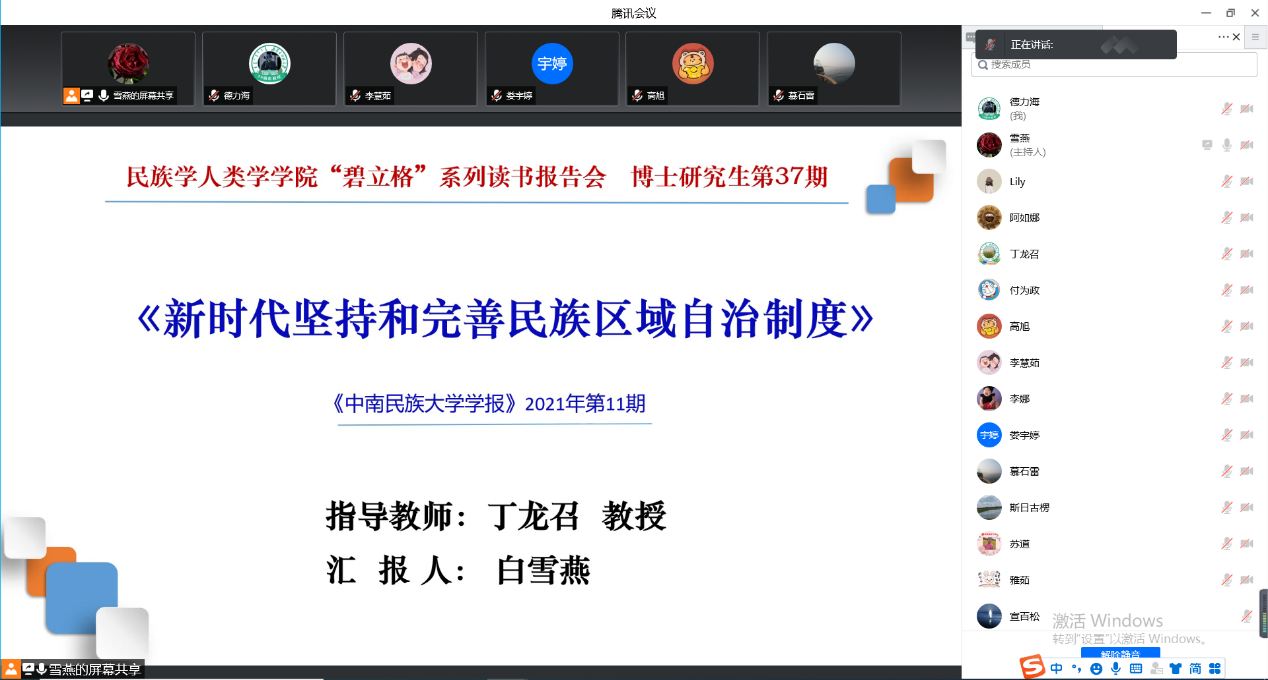 2022年5月8日下午3:00,pp电子2020级、2021级博士研究生通过“腾讯会议”举行了第37期读书报告会。本次读书报告会的汇报者是2020级马克思主义民族理论与政策专业李慧茹、2021级马克思主义民族理论与政策专业白雪燕两位博士生。博士生导师丁龙召教授出席本次读书报告会并进行指导。
