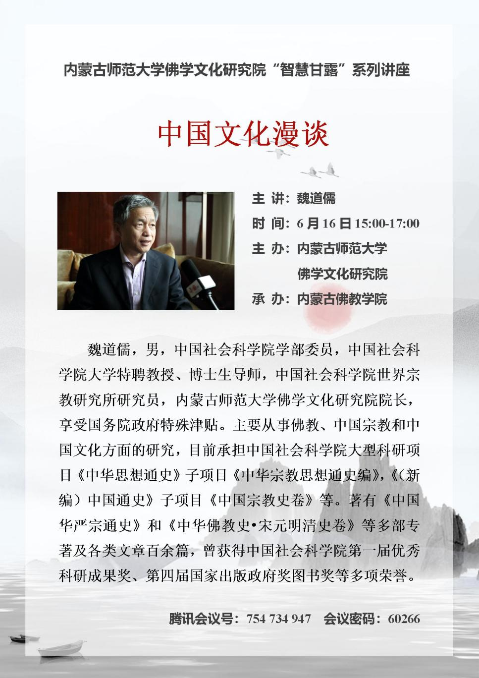6月16日下午,中国社会科学院学部委员、我校佛学文化研究院院长魏道儒先生应邀做客“智慧甘露”系列讲坛,在线上为pp电子官网师生做了题为“中国文化漫谈”学术讲座。讲座由副院长满达主持,宗教学专业全体师生及内蒙古佛教学院院长布仁满都拉等全体师生聆听了讲座。
