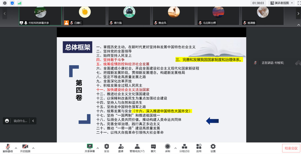 2022年11月6日19:00,pp电子2021级、2022级博士研究生通过“腾讯会议”举行了第47期读书报告会。本次读书报告会中白娜仁同学和付桂军同学分别分享了《像人类学家一样思考》和《习近平谈治国理政》第四卷两本书。