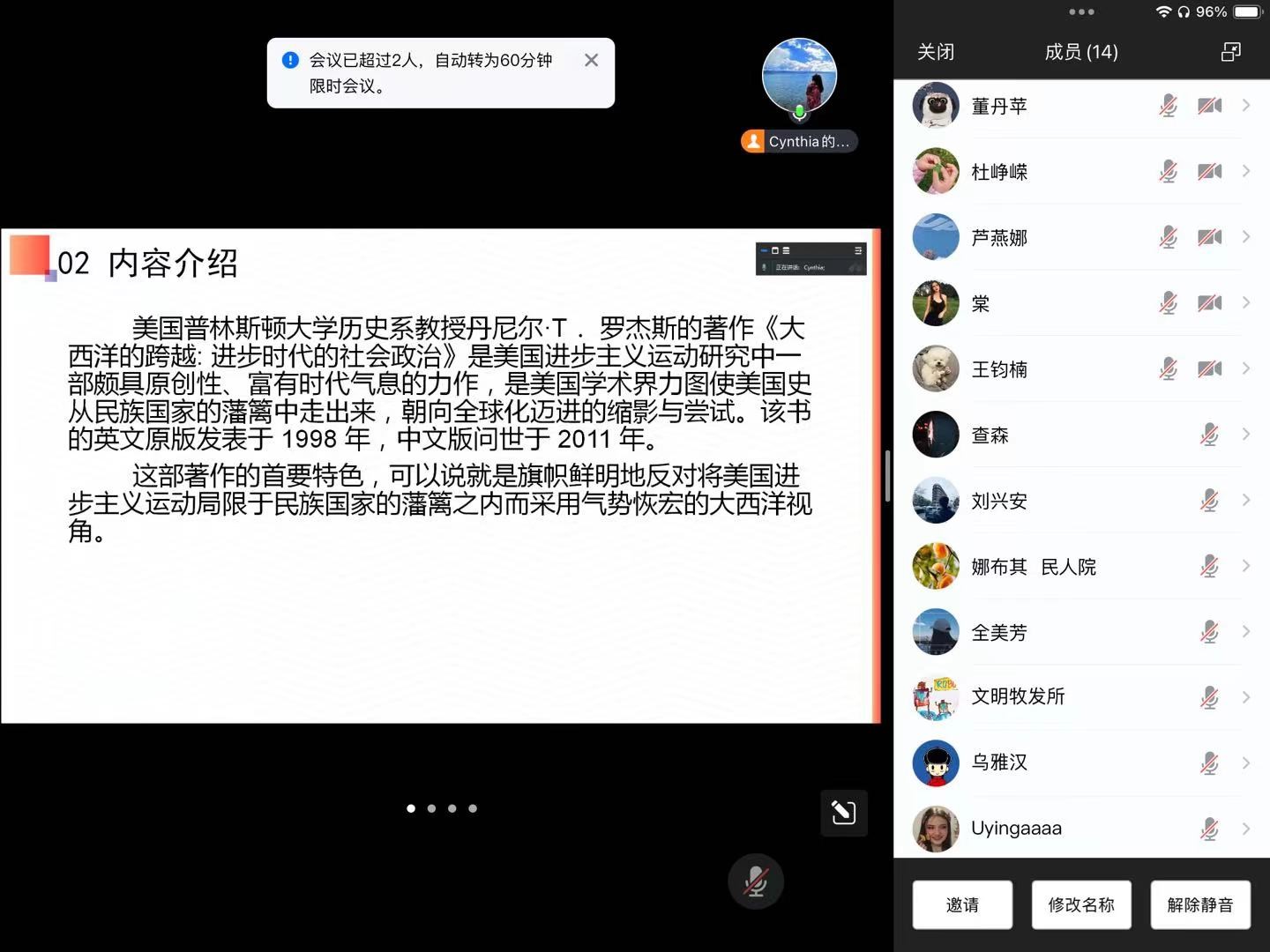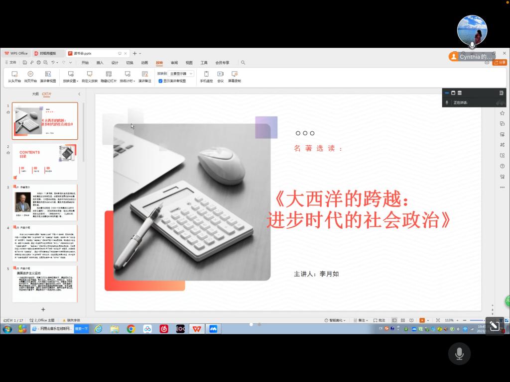 本次分享的书目是丹尼尔·T·罗杰斯的《大西洋的跨越:进步时代的社会政治》,是美国进步主义运动研究突破民族—国家史学范式之流弊,转向大西洋史学,乃至全球史学的代表作之一。作者从社会政治与跨国史研究两个角度,在时间与空间两个层面,对传统研究提出双重挑战。李月如从选择这本书的原因、本书的主要内容、以及自己读书后的心得等方面进行了介绍。她认为本书不仅对客观的认识该时期的历史有重要的学术价值,而且对学习巧妙的运用历史史料来展开论证、学习作者研究问题的视角等方面有重要的启发意义。